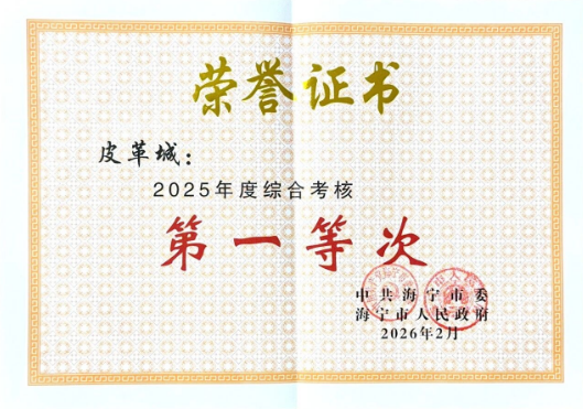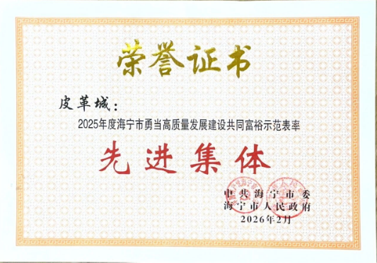 在海宁召开的全市三级干部大会上,皮革城荣获“2025年度综合考核第一等次”、“2025年度海宁市勇当高质量发展建设共同富裕示范表率先进集体”、“2025年度海宁市勇当高质量发展建设共同富裕示范表率先进企业”等三项荣誉。