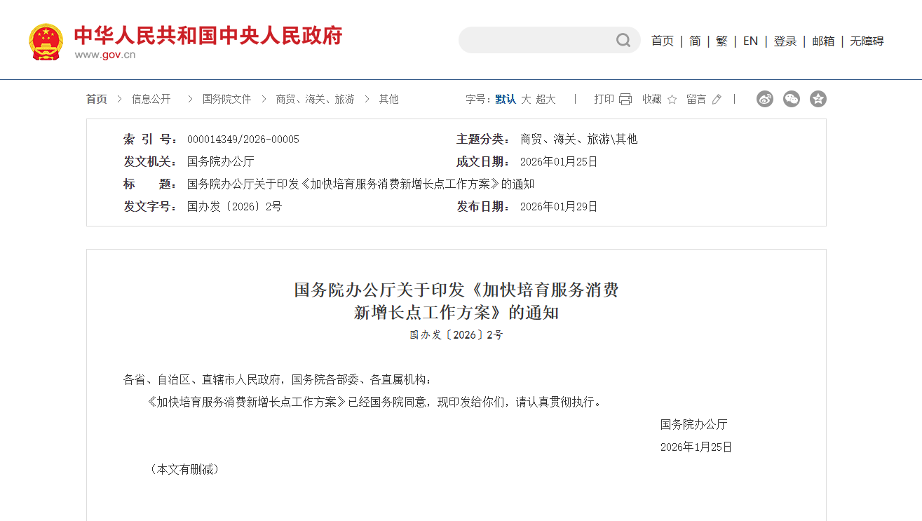 国务院办公厅关于印发《加快培育服务消费新增长点工作方案》的通知国办发〔2026〕2号各省、自治区、直辖市人民政府,国务院各部委、各直属机构:《加快培育服务消费新增长点工作方案》已经国务院同意,现印发给你们,请认真贯彻执行。国务院办公厅 2026年1月25日(本文有删减)加快培育服务消费新增长点工作方...
